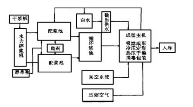 生產(chǎn)線(xiàn)是由兩臺(tái)真空模塑成形主機(jī)系統(tǒng)和與主機(jī)規(guī)模相適應(yīng)的輔助系統(tǒng)所組成, 其生產(chǎn)工藝如下:原料甘蔗漿(干漿或濕漿) 制漿,配漿,輸漿,成型主機(jī)(注漿、吸濾成形、熱壓定型、真空熱干),切邊,檢驗(yàn),成品消毒、包裝,入庫(kù)。